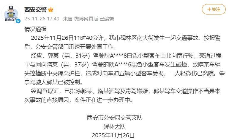 经查,郭某(男,31岁)驾驶陕A****8白色袖珍客车由北向南行驶,变谈历程中与同向隋某(男,37岁)驾驶的陕A****6玄色袖珍客车发生碰撞,致隋某车辆失控撞断中央阻遏护栏,酿成对向车谈五辆袖珍客车受损,一东谈主轻微伤已离院。闹事驾驶东谈主郭某已被截止。