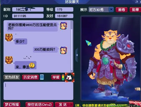 虚幻西游玩家在买东西的时候是比拟可爱讨价的,有些玩家致使嗅觉不讨价就少了点什么东西,然则在诸君玩家讨价的资格中应该莫得像上头这种玩家这样离谱的吧,上头这位玩家看中的上古玉魄摆摊摆的价钱是9,800万的虚幻币,然后上头这位玩家所还的价钱是300万的虚幻币,小编原认为上头这位玩家将会被摊主怒骂一顿。没念念到等来的竟然是喜悦往来,即是不知说念往来场合是那里。上头的这位玩家是否会被放鸽子?
